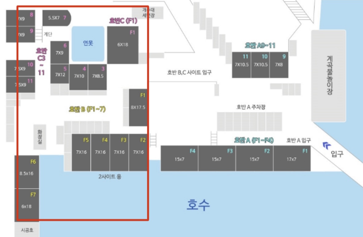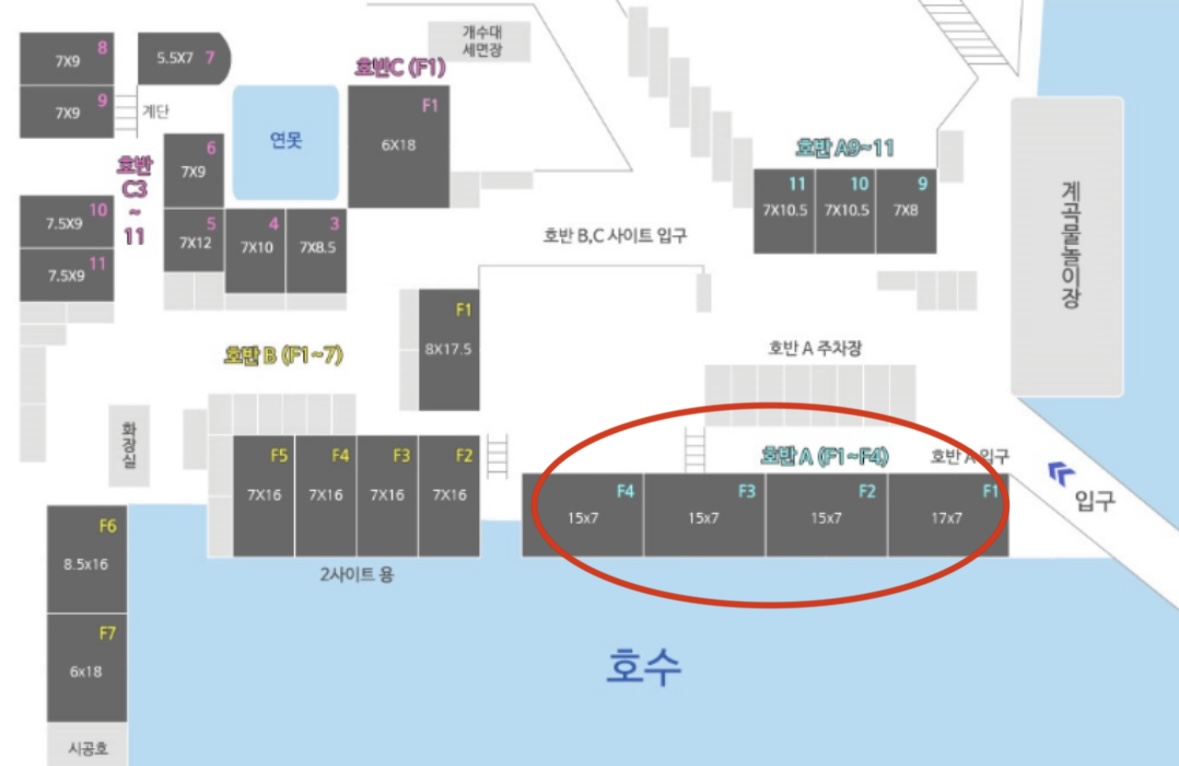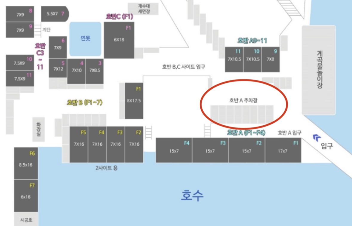 예약 할 때 부터 알고 있던 사실은, "F4번"은 가장 구석에 위치해 프라이빗 하긴 하지만 주차를 할 수 없기에 "호반 A 주차장"에