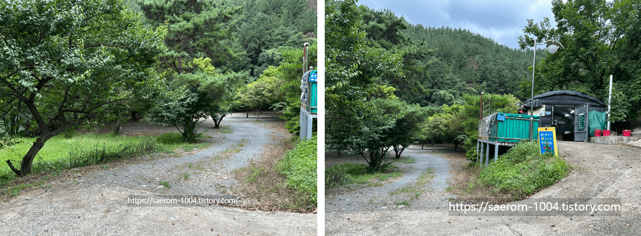 호반A 주차장에서 조금 더 올라가면 BF, C 사이트로 가는 갈림길에 보이는 검정색 건물?이 세면장, 개수대, 분리수거장입니다.